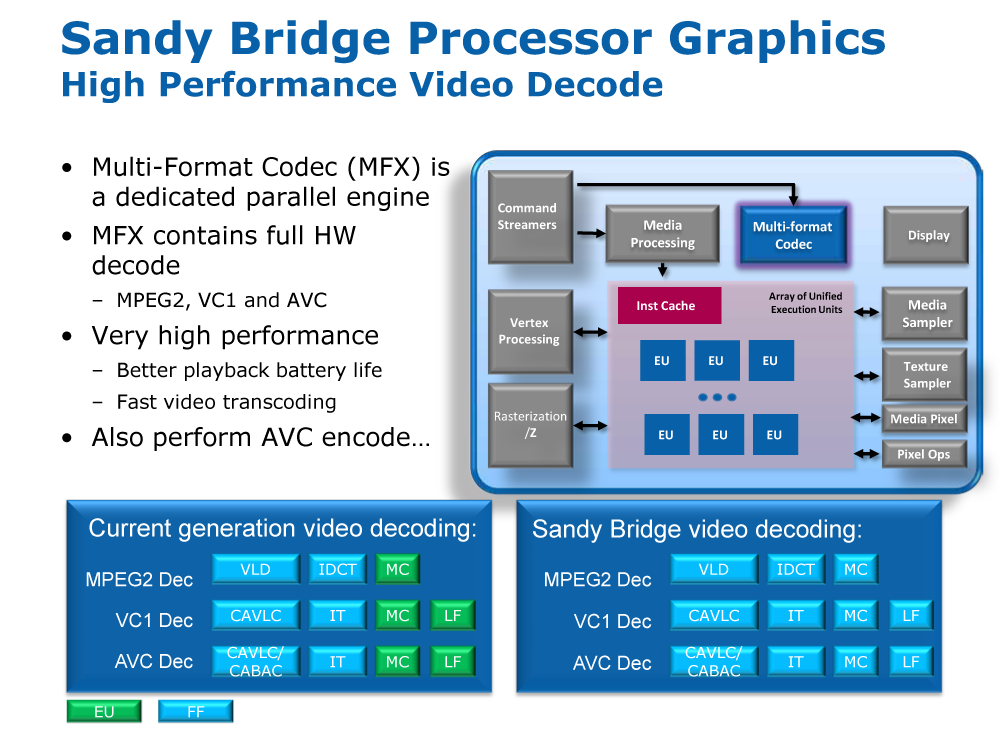Графический ускоритель, интегрированный в процессоры Sandy Bridge, был улучшен в области декодирования видео. Как мы помним, функциональность его была фактически исчерпывающей еще в прошлом поколении, но теперь выполнена оптимизация этого блока: в частности, декодирование стало целиком выполняться за счет аппаратных модулей. Раньше последние стадии декодирования, Motion Compensation и Loop Filtering, выполнялись шейдерными процессорами графического ядра, так что выигрыш на практике заключается в чуть меньшем тепловыделении (и пропорционально увеличенном запасе TDP для Turbo Boost). Также реализована поддержка независимого декодирования нескольких «серьезных» потоков HD-видео, и хотя на практике даже 2 бывает нужно очень редко (для Blu-ray 3D), теоретической производительности новых GMA HD должно хватать минимум на 3-4.