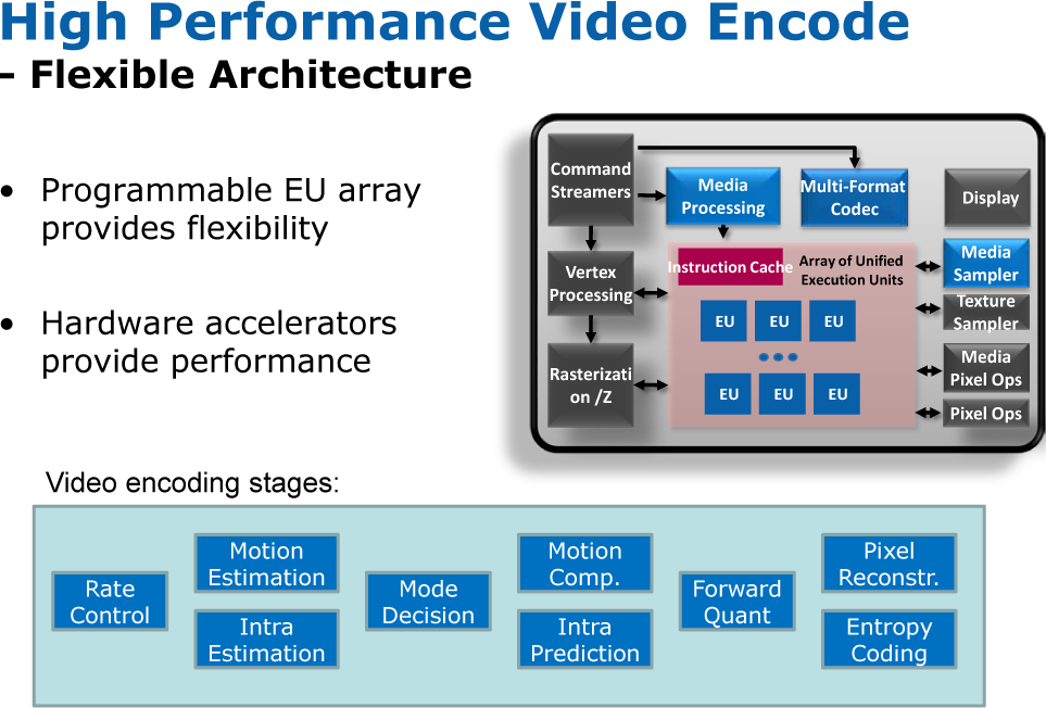 Однако ограничение на сложность и варьирование параметров кодирования пока остается в силе, так что QuickSync-кодирование будет применимо лишь в ограниченном количестве случаев. В частности, создатели x264 (несомненно лучшего и единственного достойного внимания отдельного кодера для H.264) объяснили, что для их продукта никакого выигрыша от использования Media SDK не будет, потому что основная ресурсоемкая часть при нормальном кодировании — сложная и очень сложная оценка движущихся объектов/частей кадра, Motion Estimation, а она на аппаратном уровне не выполняется.