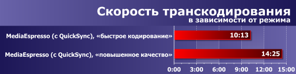 И как видим, соперничать по скорости с QuickSync никто не может. Вообще. Даже близко. Не очень понятно, правда, где эффект от использования CUDA: включение этого режима не дает ничего (де-факто результат получается даже чуть хуже, чем без аппаратного ускорения вовсе), и совсем чуть-чуть помогает в случае, когда CUDA ассистирует герою дня — QuickSync. К нашему сожалению (или, наоборот, к гордости инженеров Intel), чисто программный x264 с аппаратным кодированием соперничать не смог даже несмотря на неимоверно упрощенные настройки. Более того, программное транскодирование MediaEspresso тоже осуществляет быстрее, хотя там уже разница незначительна (для целей практического применения).