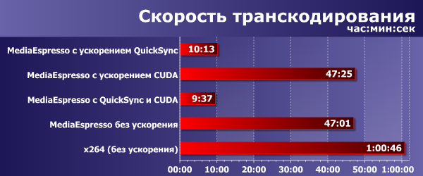 Итак, не затягивая, приведем наиболее интересные результаты тестирования: время транскодирования 2-часового фильма в случае использования CUDA, QuickSync, обеих этих технологий и ни одной из них. Для сравнения возьмем результаты аналогичного перекодирования с помощью чисто программного x264 (тесты выполнялись на весьма серьезном процессоре Core i5-2400). Правда, параметры кодирования при этом нами подбирались исключительно из соображений скорости и похожести итоговых рипов: x264 запускался с пресетом ultrafast (самый быстрый из имеющихся), а видео кодировалось под профиль AVC Baseline@L3.0, без CABAC и с ReFrames=1. Повторимся: это не осмысленный выбор удачных параметров для кодирования, а выкручивание настроек на минимум, чтобы посоперничать по скорости.