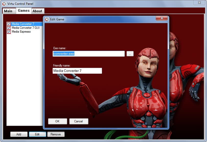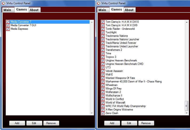 Собственно режимов работы у Virtu два. Любопытно, что изначально предполагался только один — тот, который ныне носит название i-Mode. В этом режиме основным является интегрированной ускоритель, и картинка на монитор выводится с его выходов (распаянных на задней панели материнской платы). При этом по умолчанию все приложения запускаются на встроенной графике, и вывод картинки осуществляется естественным образом. Исключение делается только для приложений из специального списка — они запускаются на дискретной видеокарте, а драйвер осуществляет «подмену» буфера кадров. Разумеется, в случае i-Mode необходимость в исключениях есть только для игр, поэтому соответствующая закладка со списком приложений называется «Games». Новые («неизвестные драйверу») программы добавляются в этот список штатным образом, имеющиеся пункты списка можно отредактировать или отменить их применение (снять галочку).