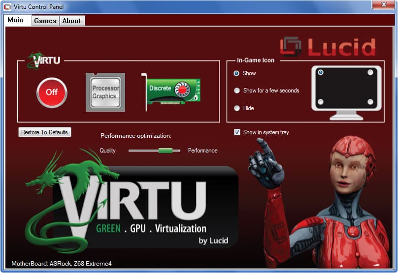 О режиме функционирования Virtu свидетельствует панель управления. Там можно включать и отключать работу технологии в один щелчок мыши, при этом ничего не «падает» и не «глючит». При отключенной Virtu операционная система штатно работает с выводом обоих видеоускорителей — можно, например, подключить два монитора и расширить рабочий стол на монитор, подключенный к «неосновному» адаптеру. После включения Virtu активными становятся выходы только одного видеоускорителя: по умолчанию это «первичный» адаптер, но если к его выходам монитор не подключен, то драйвер Lucid автоматически меняет режим работы и считает основным второй адаптер и его монитор.
