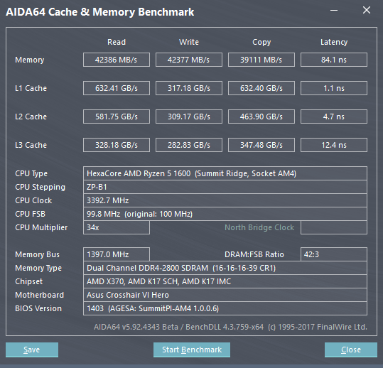 Для практической проверки модулей мы собрали тестовый стенд на базе платы Asus Crosshair VI Hero и процессора AMD Ryzen 5 1600 — как нам кажется, именно в системах такого класса применение недорогой памяти наиболее оправданно. Для быстрой проверки низкоуровневых характеристик мы воспользовались тестовым модулем программы AIDA64 5.92.4343.
