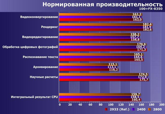 Поэтому мы провели тесты по нашей стандартной методике измерения производительности на основе реальных приложений. В двух режимах (стандартном и на частоте 2800 МГц), взяв также для сравнения результаты референсной системы, где использовалась память с частотой 2933 МГц. Несложно заметить, что они выше, однако ни в одной группе разница не превышает 2,5%, а в общем итоге не достигает и 2%. При этом небольшой разгон модулей, доступный практически на любой плате позволяет сократить разницу до 0,5%, что пренебрежимо мало.