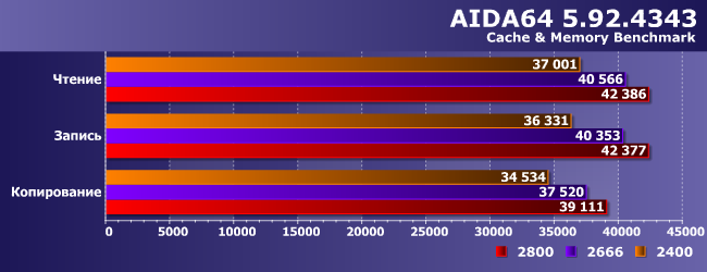 Сведем результаты тестов пропускной способности памяти в полученных трех режимах работы (штатном, немного разогнанном без увеличения напряжения и максимально-стабильном) на одну диаграмму. Как видим, результаты практически прямо пропорциональны частоте, что неудивительно. Однако не дает ответа на вопрос влияния модулей памяти на производительность в реальных задачах. В данном случае очень важный — ведь 2800 и, тем более, 2400 МГц, повторимся, считается очень низкой частотой для процессоров AMD Ryzen.