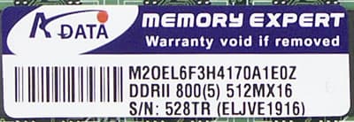 Что приятно, номера модулей на стикерах снаружи и внутри совпадают (серийные номера, однако, уже не сходятся). Тем не менее, руководство по расшифровке Part Number модулей памяти Vitesta DDR2 на сайте производителя отсутствует. На странице описания модулей указаны лишь основные технические характеристики: емкость каждого модуля составляет 256 или (в нашем случае) 512 МБ, модули основаны на микросхемах 32Mx8, функционируют при величине задержки CAS# = 5 и стандартном напряжении питания 1.85±0.1V.