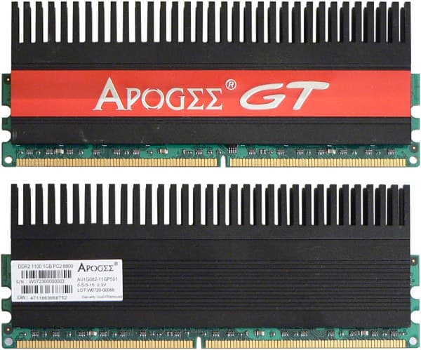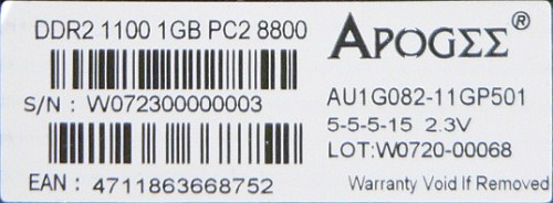 Руководство по расшифровке Part Number модулей памяти на сайте производителя отсутствует. Есть лишь краткое описание на сайте. Apogee GT DDR2-1100 представляет собой комплект из двух модулей объемом 1024 KБ каждый, основанных на 16 микросхемах в FBGA-упаковке с конфигурацией 64M x 8. Производитель гарантирует стабильную работу модулей в режиме DDR2-800 при таймингах 5-5-5-15 и питающем напряжении 1,8 В, а также DDR2-1100 с аналогичными таймингами и напряжении 2,3 В. В микросхеме SPD в качестве режима по умолчанию выбран режим DDR2-800 со схемой таймингов 5-5-5-15 и напряжением питания 1,8 В.