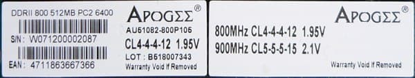 Руководство по расшифровке Part Number модулей памяти DDR2 на сайте производителя отсутствует. Из более чем краткого описания на сайте и по обозначениям на самих модулях, можно заключить, что продукт представляет собой комплект из двух модулей с низкими задержками (CL4) объемом 512 KБ каждый, основанных на 16 микросхемах в BGA-упаковке с конфигурацией 64M x 8. Производитель гарантирует стабильную работу модулей в режиме DDR2-800 при таймингах 4-4-4-12 и питающем напряжении 1,95 В, а также DDR2-900 при таймингах 5-5-5-15 и напряжении 2,1 В. В микросхеме SPD в качестве режима по умолчанию выбран режим DDR2-800 со схемой таймингов 5-5-5-15 и напряжением питания 1,8 В.