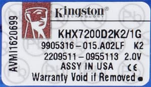Руководство по расшифровке Part Number модулей памяти DDR2 на сайте производителя отсутствует. В краткой технической документации модулей с Part Number KHX7200D2K2/1G указывается, что продукт представляет собой комплект из двух модулей объемом 512МБ каждый, имеющих конфигурацию 64M x 64 и основанных на микросхемах с конфигурацией 64M x 8. Модули принадлежат к неофициальной скоростной категории «DDR2-900» и способны функционировать в указанном режиме при величине задержки CAS# = 5. Производитель гарантирует 100% стабильную работу модулей в режиме DDR2-900 при таймингах 5-5-5-15 и питающем напряжении 2.0 В, но в микросхеме SPD в качестве режима по умолчанию прописан стандартный DDR2-667 с таймингами 5-5-5-15 и напряжением питания 1.8 В.
