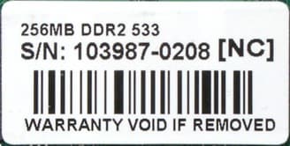 Оказавшиеся в нашем распоряжении модули памяти содержат информацию лишь о серийном номере. Согласно данным производителя (а также данным микросхемы SPD модуля), 256-МБ небуферизованным модулям памяти DDR2-533 соответствует Part Number вида TS32MLQ64V5F. Тем не менее, расшифровка Part Number модулей памяти, а также технические характеристики данного типа модулей на сайте производителя отсутствуют.