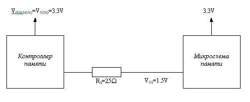 - Группа данных основана на сбалансированной топологии типа "Т". Для нее регламентировано ограничение по нагрузке 10 Ом на вход каждой линии, где длина сигнальной трассы подразделяется на две подкатегории длин дросселей развязки: исходя из общей длины трассы между выводом микросхемы памяти и системного контроллера, рекомендуется минимальная длина на модуле DIMM и максимальная для трассы на материнской плате (согласно спецификации, максимум — 7.5 см);