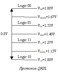 Отдельного упоминания заслуживает принципиально усовершенствованный многоуровневый RSL сигнальный протокол QRSL (Quad RSL), основанный на использовании кода Грэя (Gray). Смысл его применения сводится к тому, что удвоить пропускную способность можно не только временным "уплотнением" сигналов данных относительно синхросигнала, где нарастающий и спадающие фронты являются старт-позициями для приема-передачи бита данных (технология DDR: DDR SDRAM, RDRAM, SLDRAM, RLDRAM), а и кодированием логических состояний. При этом совместимость по уровням с протоколом RSL_1.8 полностью сохраняется, но добавляются еще два промежуточных для кодирования двухбитных последовательностей. Теперь логические уровни выглядят следующим образом: 00 — 1.8 В (VTERM), 01 — 1.53 В, 11 — 1.27 В, 10 — 1.00 В. Поскольку высокоточные логические уровни требуют обязательного присутствия линий контроля девиаций, то помимо уже имеющегося в RSL основного VREF=1.4 В (теперь 01-11), в QRSL введены еще два дополнительных уровня опорного напряжения: VREFH=1.67 В (00-01) и VREFL=1.13 В (11-10) — так называемые псевдодифференциальные приемники с тремя различными точками входа опорного напряжения. Таким образом, уплотнение приема-передачи данных можно добиться и методом кодирования последовательностей. Иными словами, при использовании SDR-интерфейса сигнала с применением протокола QRSL можно добиться фактического удвоения пропускной способности. Если использовать еще и DDR-интерфейс, то можно получить 4bit "отдачу" за один такт. Теперь при разности верхней и нижней точки в 800 мВ, разность между соседними логическими уровнями составляет около 267 мВ. При этом импеданс разрабатываемой системы должен составлять нестандартные 40W. Естественно, что такая модификация потребует некоторых дополнений в общий интерфейс подсистемы — это и терминирование строго в один конец (применяется еще с момента RSL), и новые цепи управления (Driver) и приема (Receiver), включающие интегрированные приемники, и общий дифференциальный синхросигнал, четко синхронизирующий данные на одинаковой с RSL частоте, и, наконец, общий двунаправленный канал. Несмотря на всю свою привлекательность, новая разработка ориентирована в первую очередь на игровые приставки и аркадные автоматы, однако не исключена возможность использования данной технологии в подсистемах ПК с замкнутым циклом синхронизации без возможности модульного расширения — например, в видеоадаптерах.
