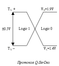 | ** — Два переключающихся состояния по 500 мВ каждое, представляющие собой дифференциальные (относительно передатчика) IV-входы, игнорирующие потери | |||||||
