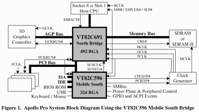 Давний конкурент Intel, тайваньская компания VIA, в настоящий момент предлагает чипсет VIA Apollo Pro — второе поколение Apollo P6, первого неинтеловского чипсета для Slot-1. Состоит из ядра VT82C691, обеспечивающего как синхронное так и асинхронное функционирование шин памяти, AGP и PCI, и южного моста VT82C596, позаимствованного от старого знакомого MVP-3 и позволяющего, кроме базовых функций ввода-вывода (ACPI, USB, порты), реализовать новый интерфейс UltraATA-66. Кстати, VIA Apollo Pro, как и i440BX, поддерживает режим Suspend to DRAM.