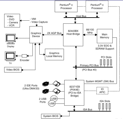 Базовый набор микросхем Intel 440BX состоит из двух чипов — ядра 82443BX и контроллера ввода-вывода PIIX4E 82371EB. Интеловский чипсет поддерживает двухпроцессорность (SMP), и 64-разрядный оптимизированный 3.3-вольтовый интерфейс памяти, не поддерживающий 5-вольтовые модули. Поддерживается 33-мегагеровая шина PCI версии 2.1 и AGP 1.0, функционирующая в режимах 1х и 2х.