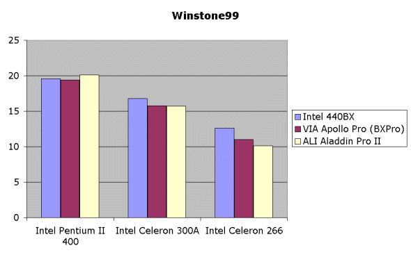 Теперь посмотрим на результаты финального теста быстродействия — Winstone99, показывающего средневзвешенную производительность в Windows95/98.