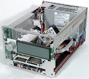 Теперь вернемся все же к основному предназначению barebone-комплекта, тем более что, как уже было сказано выше, два режима работы Mega PC вообще не пересекаются. Внешность этой модели (за исключением, разумеется, верхней части передней панели) уже знакома нам по многочисленным Shuttle XPC и вариациям на ту же тему от других производителей. Алюминиевый корпус размерами 202(Ш)x320(Г)x151(В) мм довольно легок, будучи пустым; из его особенностей можно отметить разве что «лишнюю» группу вентиляционных отверстий на боковой стенке да отделанные по окружности металлом (или пластиком «под металл») низенькие ножки последнее уже явно дань позиционированию комплекта на уровень солидной бытовой техники.