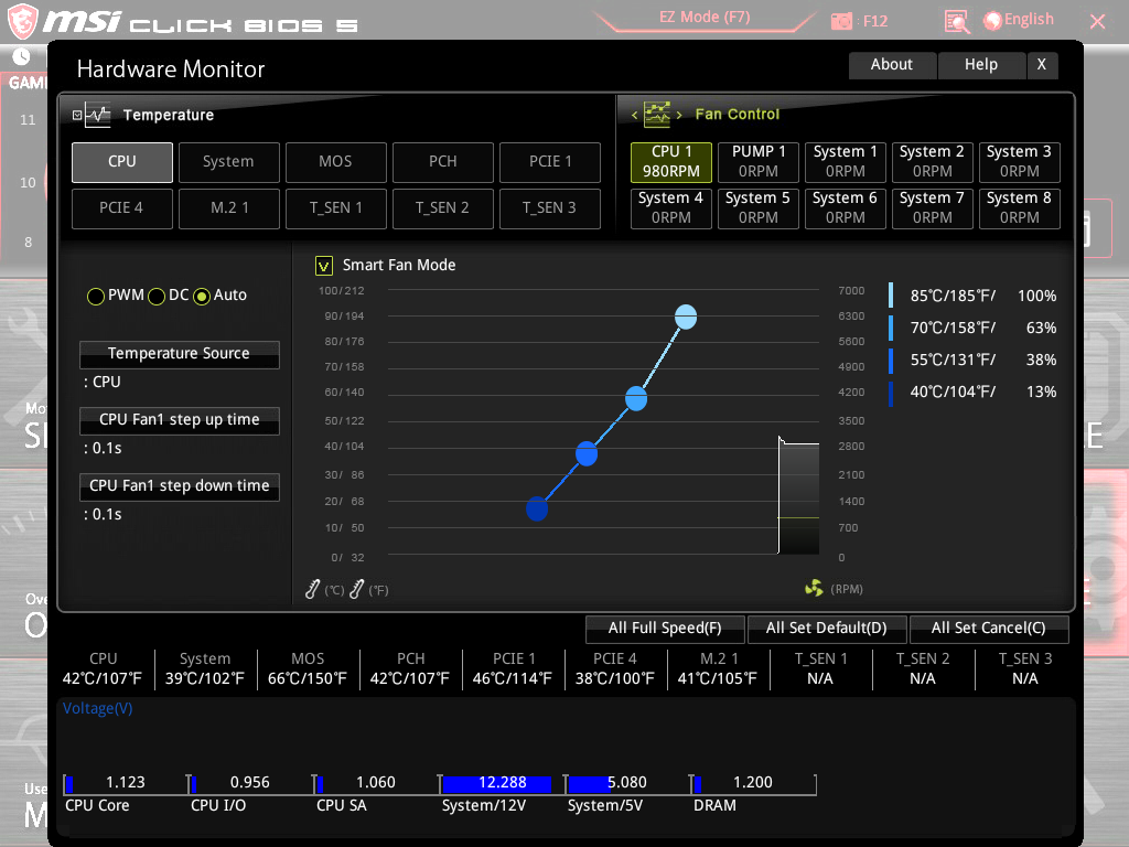 Подраздел Hardware Monitor предназначен для контроля температуры процессора процессора и системы, скорости вращения подключенных вентиляторов и напряжений. Кроме того, в этом же подразделе можно настроить скоростной режим вентиляторов по четырем точкам на графике зависимости скорости вращения от температуры процессора или системы. Причем производимые изменения сразу же вступают в силу.