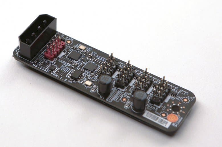 Помимо всего перечисленного в комплект поставки входит также отдельная плата USB Xpander, представляющая собой USB-хаб на четыре порта USB 2.0. Эта плата подключается специальным кабелем (входит в комплект) к USB-разъему на плате и к периферийному разъему блоку питания.