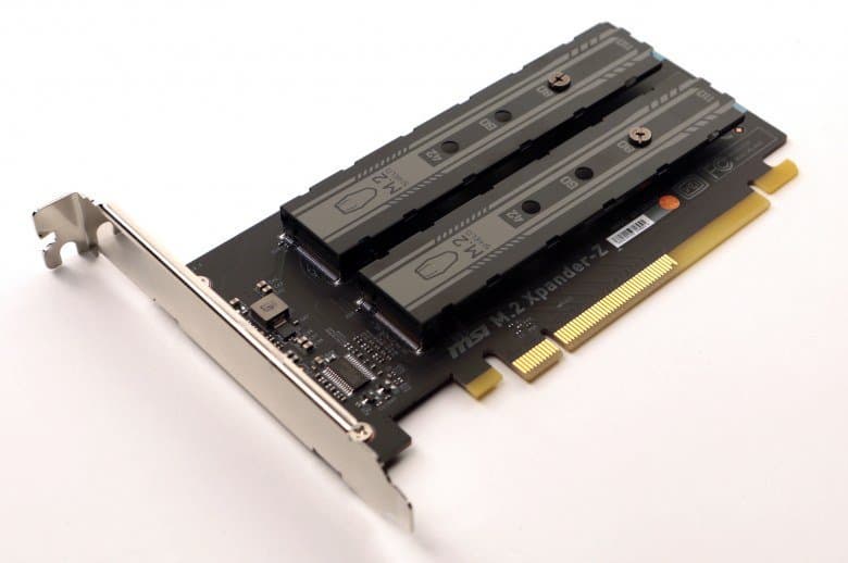 Еще один приятный бонус — это карта расширения M.2 Xpander-Z с интерфейсом PCIe 3.0 x8 на два накопителя c разъемами M.2 и интерфейсом PCIe 3.0 x2/x4. Накопители могут иметь типоразмер 2242/2260/2280/22110. Для обоих накопителей на плате предусмотрены радиаторы.