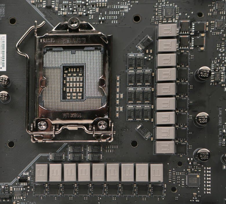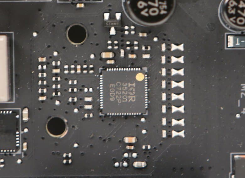Регулятор напряжения питания процессора на плате является 18-канальным и управляется 8-фазным (8+0/7+1/6+2) PWM-контроллером IR35201 (International Rectifier). В самих каналах питания используются чипы IR3555, объединяющие в себе два MOSFET-транзистора и драйвер. Удвоители фаз питания расположены с обратной стороны платы.