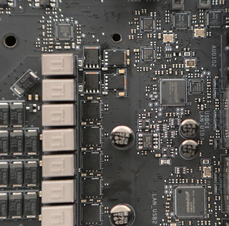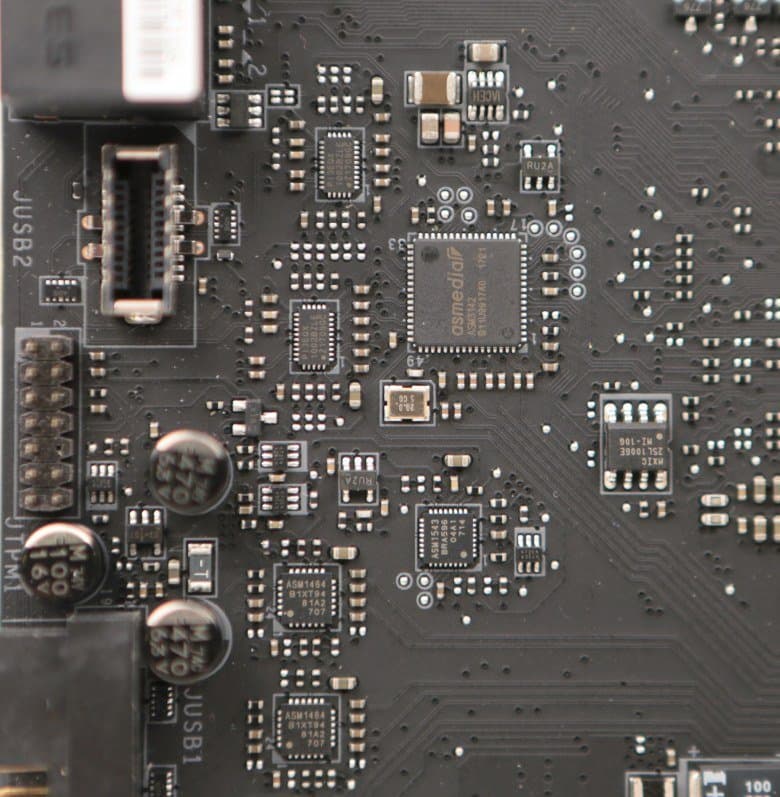Два порта USB 3.1, выведенные на заднюю панель платы, реализованы на базе контроллера ASMedia ASM3142, который подключается к чипсету по двум линиям PCIe 3.0. Причем один порт имеет разъем Type-A, а другой — разъем Type-C. Эти порты выведены на заднюю панель платы.