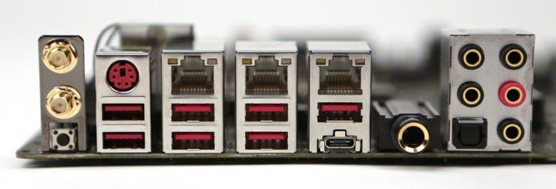 | Разъемы на задней панели | 6 × USB 3.0 (Type-A) 1 × USB 3.1 (Type-C) 1 × USB 3.1 (Type-A) 3 × RJ-45 1 × S/PDIF (оптический, выход) 5 аудиоразъемов типа миниджек (3,5 мм) 1 аудиоразъем джек (6,3 мм) 1 × PS/2 |
