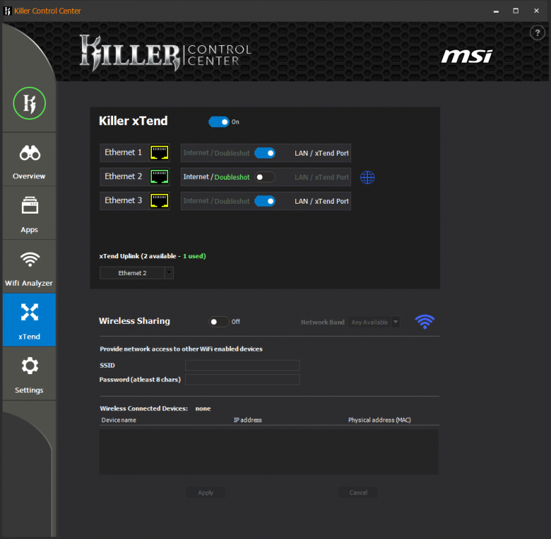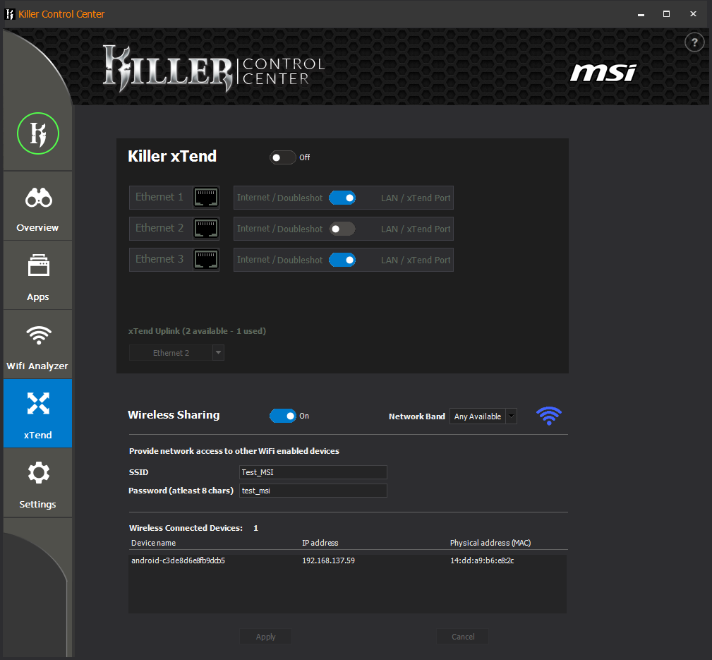 В сравнении с возможностями современных беспроводных роутеров возможности технологии Killer xTend довольно скромные. Так, для сети WLAN можно задать только SSID и пароль, после будет создана беспроводная сеть с пропускной способностью до 866 Мбит/с. В утилите Killer Control Center можно посмотреть подключенные устройства с их IP- и MAC-адресами.