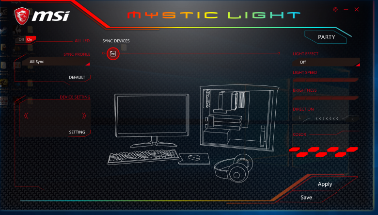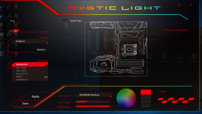 Вообще, утилита MysticLight позволяет не только настраивать подсветку на плате, но и синхронизировать подсветку подключаемых к плате устройств (клавиатуры, мышки, наушников), если эти устройства, конечно, поддерживают данную возможность. На самой плате подсвечивается 21 элемент. Это радиатор чипсета, кожух задней панели разъемов, радиаторы регулятора напряжения питания. Кроме того, есть ряд светодиодов, подсвечивающих слоты PCI Express x16, разъемы M.2, а также светодиоды около разъемов для подключения вентиляторов. С использованием утилиты MysticLight, можно создать и сохранить индивидуальный профиль подсветки, выбрав цвет и эффект свечения. Есть возможность синхронизировать все светодиоды на плате и на подключаемой ленте Rainbow, а можно настроить подсветку каждого из 21 подсвечиваемых элементов и подключаемых к плате cветодиодных лент по отдельности.