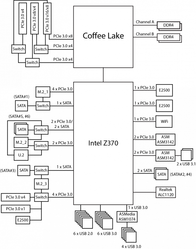 Напомним, что кроме поддержки разных семейств процессоров чипсет Intel Z370 ничем не отличается от Intel Z270. Intel Z370 имеет 30 высокоскоростных портов ввода/вывода (HSIO), в качестве которых могут быть порты PCIe 3.0, USB 3.0 и SATA 6 Гбит/с. Часть портов строго фиксирована, но есть HSIO-порты, которые могут конфигурироваться как USB 3.0 или PCIe 3.0, SATA или PCIe 3.0. Причем всего может быть не более 10 портов USB 3.0, не более 6 портов SATA и не более 24 портов PCIe 3.0.