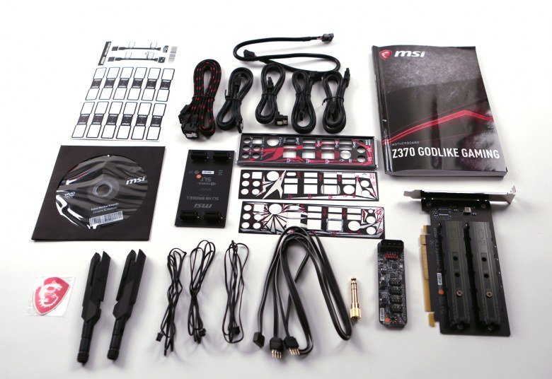 Комплект поставки красноречиво говорит о том, что речь идет о топовом продукте. Кроме традиционного руководства пользователя и DVD-диска с драйверами и утилитами, в комплект поставки входят стикеры для кабелей, шесть SATA-кабелей в тканевой оплетке (все разъемы с защелками, три кабеля имеют угловой разъем с одной стороны), заглушка для задней панели платы, мостик SLI на две видеокарты, три термодатчика, две антенны встроенного Wi-Fi-модуля и кабель, представляющий собой Y-разветвитель длиной 80 см для подключения двух RGB-лент.