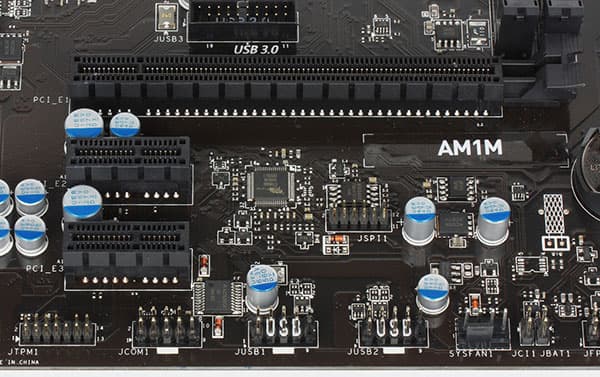 SoC Kabini поддерживают до восьми линий PCIe 2.0, часть из которых может быть объединена для поддержки слота PCIe x4. Таковой на плате реализован, но имеет физическое исполнение PCIe x16, что улучшает совместимость с картами расширения — возможно даже использование дискретных видеокарт. Для большинства процессоров семейства это не требуется, но в нем сейчас есть и два Athlon X4 с заблокированным видеоядром, с которыми можно поэкспериментировать (особенно при наличии ранее купленной видеокарты, уровнем выше встроенного в другие APU Radeon R4). Кроме того, на плате есть два слота PCIe x1, куда можно установить карты расширения, не нуждающиеся в высокой пропускной способности интерфейса.