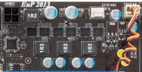 Стабилизатор напряжения питания процессора — 3-канальный, используются современные высокоэффективные полевые транзисторы с Low RDS (on), установлены 4 твердотельных конденсатора по 820 мкФ и 2 — по 270 мкФ. Ясно, что процессор, TDP которого находится в пределах 18 Вт, в более мощной схеме не нуждается.