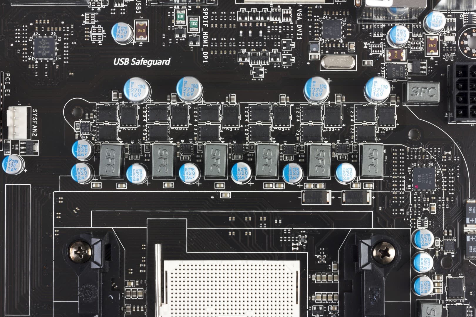 Именно компонентам в цепи питания процессора плата обязана своему «милитаристскому» позиционированию. Твердотельными конденсаторами сейчас, конечно, трудно кого-либо удивить, но на данной плате, по заявлению производителя, они способны выдержать до 10 лет работы в самых жестких условиях. Катушки SFC (Super Ferrite Choke) пропускают «на 30% больший ток по сравнению с обычными».