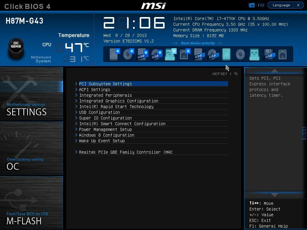На основном экране представлена краткая информация о материнской плате, процессоре, их температуры, объем и частота оперативной памяти, дата и время. Отдельным списком с возможностью выбора указаны текущие загрузочные устройства. Чуть ниже находятся шесть разделов. В первом из них — Settings — собраны все традиционные настройки материнских плат: дата и время, опции периферийных контроллеров и чипсета, параметры загрузки операционной системы, парольная защита и другие. Здесь же разместили и пункты записи и выхода. Последние операции можно осуществить и горячими клавишами.