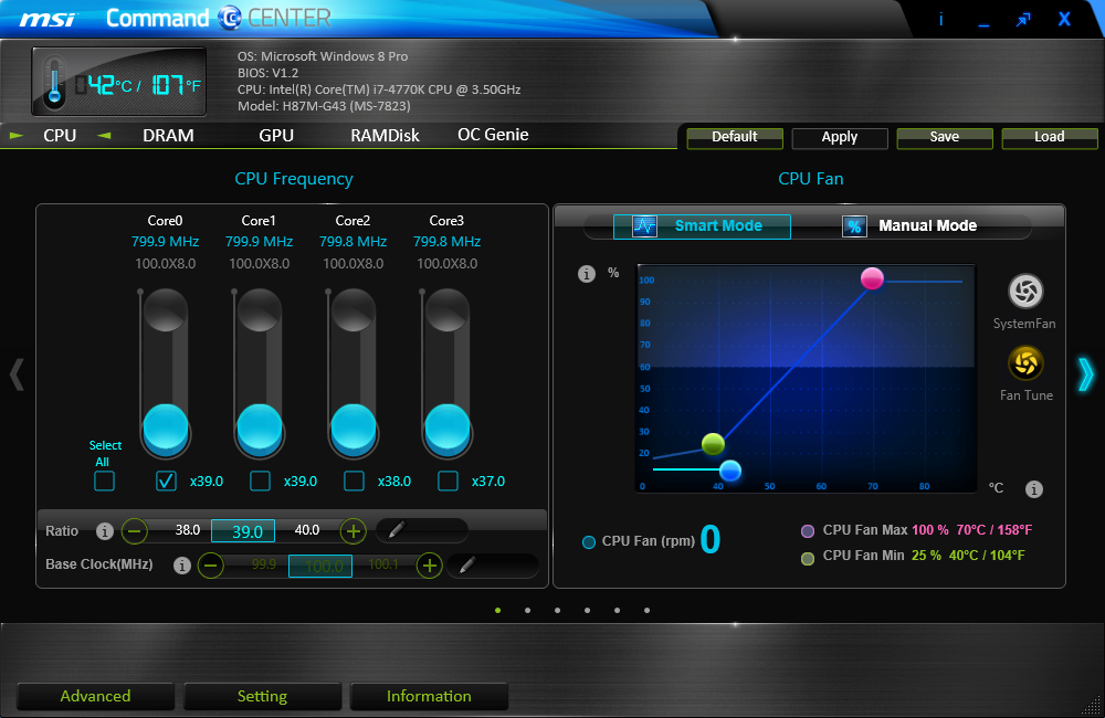 Управление скоростями работы вентиляторов возможно через настройки в BIOS или утилиту Command Center. Отметим, что поддерживаются только PWM-модели, а диапазон регулировок относительно невелик — 20—100% для процессорного и 50—100% для системных. Правда, по факту эти проценты переводятся в скорость не очень хорошо. Для одной из моделей кулера от боксового процессора получаемые скорости вращения крыльчатки составили 1900—2600 и 2200—2600 об/мин соответственно. Но сам процесс регулировки сделан неплохо — скорость меняется очень медленно, так что никаких негативных акустических эффектов вы не заметите.