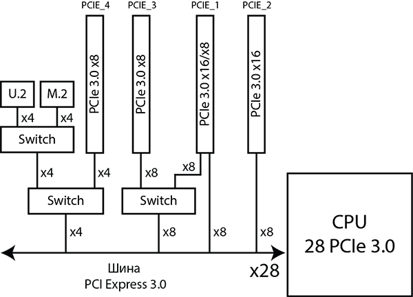 Схема разделения линий PCIe 3.0 для случая процессора с 28 линиями PCIe 3.0 представлена далее.