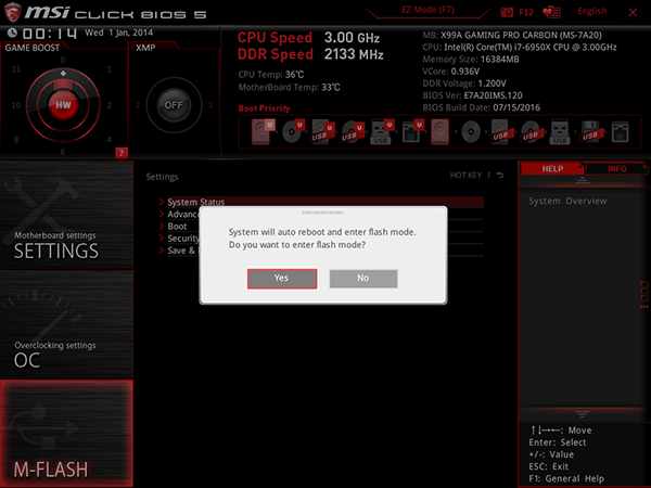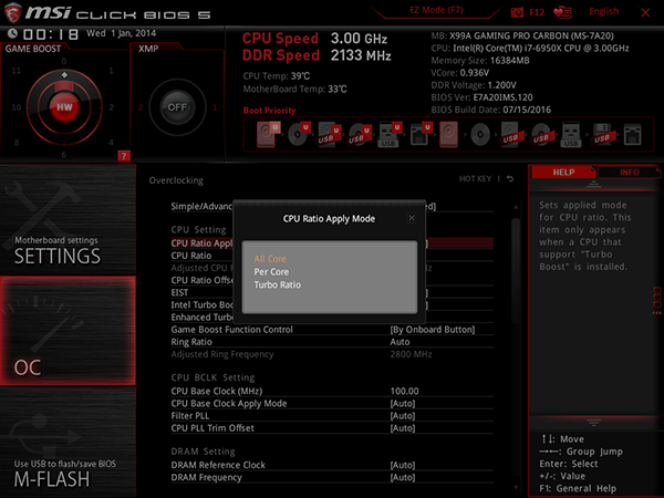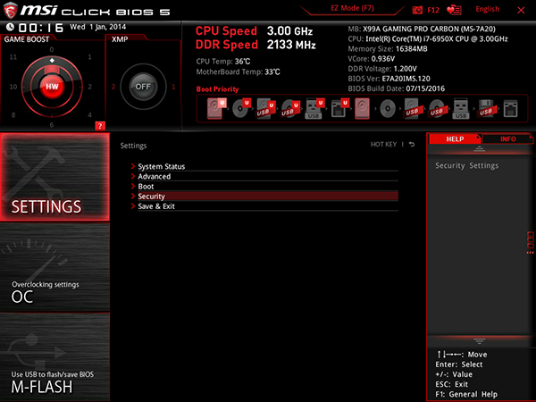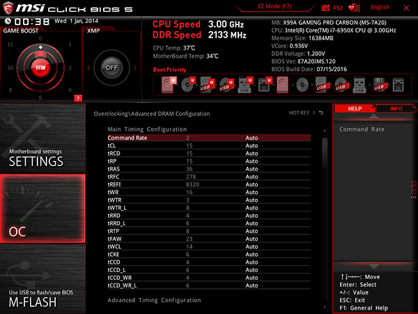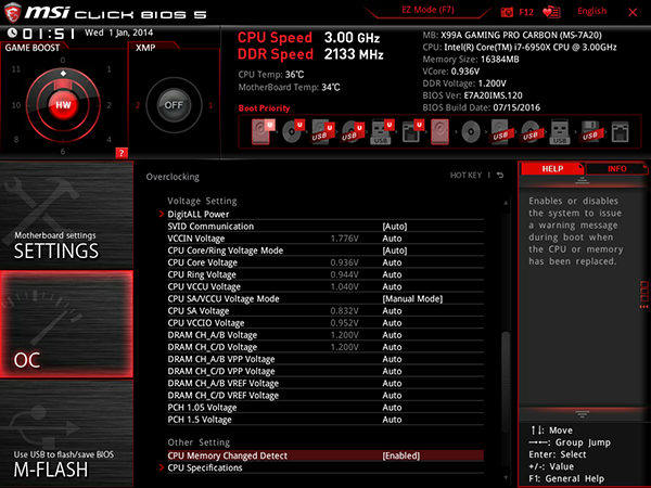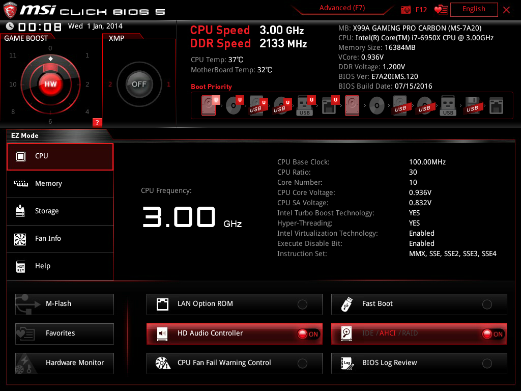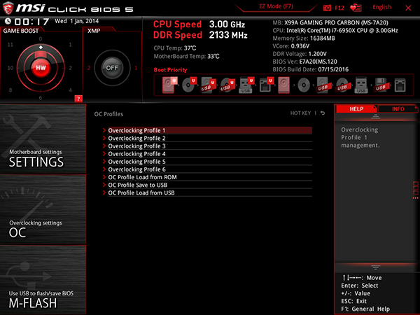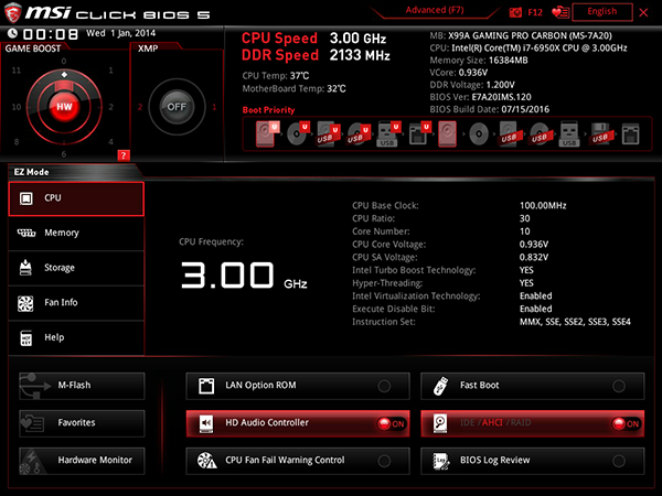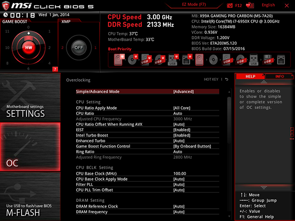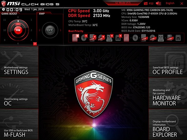 На плате MSI X99A Gaming Pro Carbon используется UEFI BIOS с точно таким же интерфейсом, как и на других новых платах MSI (в частности, на платах с чипсетом Intel Z170).