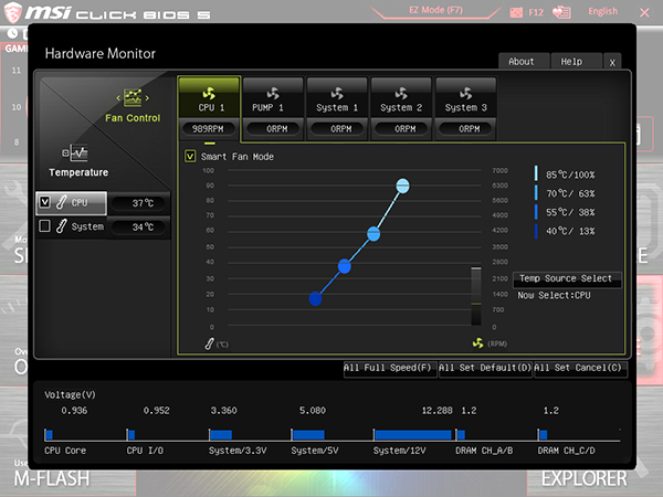 Подраздел Hardware Monitor предназначен для контроля температуры процессора процессора и системы, скорости вращения подключенных вентиляторов и напряжений. Кроме того, в этом же подразделе можно настроить скоростной режим вентиляторов по четырем точкам на графике зависимости скорости вращения от температуры процессора или системы. Причем производимые изменения сразу же вступают в силу.