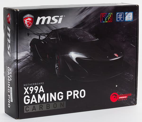 Плата MSI X99A Gaming Pro Carbon поставляется в компактной коробке, на которой нанесено название платы и перечислены все ее особенности.