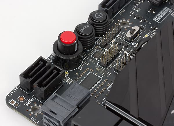 Есть на плате и специальная поворотная восьмипозиционная кнопка Game Boost Knob, предназначенная для разгона процессоров Broadwell-E путем изменения коэффициента умножения. Позиции кнопки нумеруются как 0, 1, 2, 4, 6, 8, 10, 11. Конечно, возникает вопрос: а где 3, 5, 7 и 9? Но здесь все почти просто. Каждая цифра означает прибавку в сотнях МГц относительно номинальной частоты процессора. К примеру, 6 означает, что частота увеличена на 600 МГц. Почему мы говорим, что почти просто? Дело в том, что указанному правилу не соответствует цифра 11 и по логике, должна быть не 11, а 12.