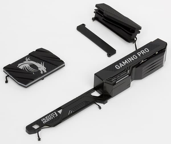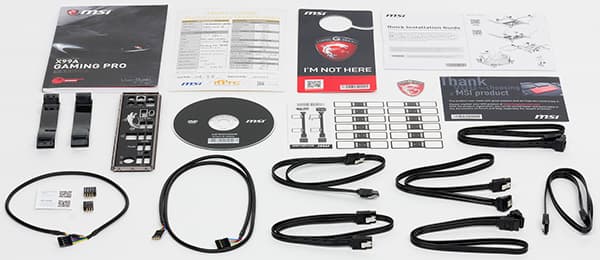 Кроме самой платы в комплект поставки входит инструкция пользователя, DVD-диск с программным обеспечением и драйверами, шесть SATA-кабелей (все разъемы с защелками, три кабеля имеют угловой разъем с одной стороны), два мостика SLI на две видеокарты, заглушка задней панели платы и два кабеля RGB LED (40 см и 60 см) для подключения светодиодной ленты. Есть в комплекте и стикер c логотипом продукции MSI игровой серии, а также набор стикеров для SATA-кабелей.