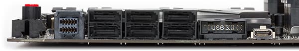 Из девяти портов USB 3.0 пять портов реализовано на базе интегрированного в чипсет контроллера. Один из эти портов имеет разъем Type-C и расположен между разъёмом питания и колодкой с SATA-портами. Для подключения еще четырех портов USB 3.0 на плате имеется два разъема.