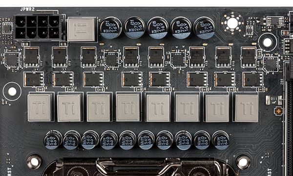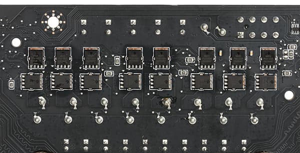 Каждый канал питания основан на дросселе «Titanium Choke» и четырех MOSFET-транзисторах производства NikoS. Таким образом, всего в регуляторе напряжения питания процессора используется 32 MOSFET-транзистора. Причем 16 из них расположены с обратной стороны платы.