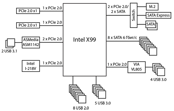 Напомним, что в чипсете Intel X99 общее количество портов PCIe 2.0 не может превышать восьми, причем суммарно может быть не более 22 высокоскоростных порта ввода/вывода (PCIe 2.0, SATA 6 Гбит/с, USB 3.0). Из 22 высокоскоростных портов ввода/вывода 18 портов строго фиксировано: это четыре порта USB 3.0, шесть портов PCIe 2.0 и восемь портов SATA 6 Гбит/с. А вот еще четыре порта можно переконфигурировать: два из них могут работать либо как USB 3.0, либо как PCIe 2.0, а еще два других – как PCIe 2.0 или SATA 6 Гбит/с.