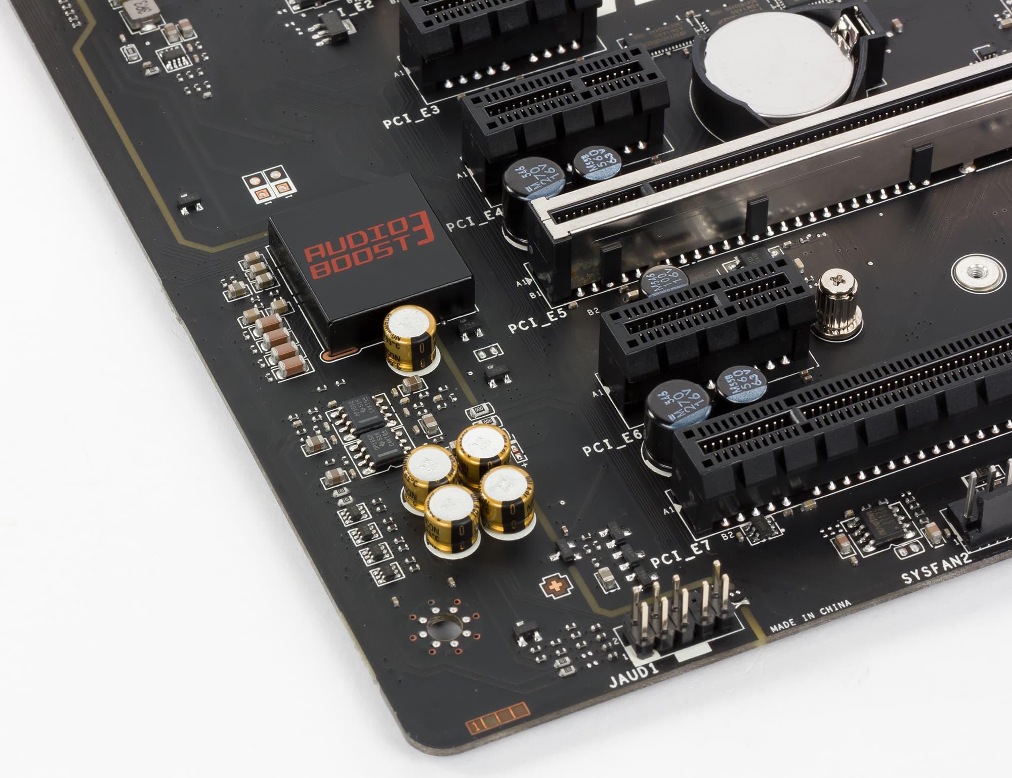 Два первых (от процессорного разъема) слота с форм-фактором PCI Express x16 реализованы с использованием 16 линий PCI Express 3.0 процессора Skylake, которые, с применением мультиплексоров/демультиплексоров ASMedia ASM1480, группируются либо в один порт PCI Express 3.0 x16, либо в два порта PCI Express 3.0 x8. То есть если задействуется только один слот с форм-фактором PCI Express x16 (ближайший к процессорному разъему), то он будет работать на скорости x16, а если одновременно оба слота, то они будут функционировать на скорости x8. Отметим, что упомянутые слоты PCI Express x16 имеют металлический кожух, который, по заявлению представителей компании, способствует увеличению жесткости этих слотов. Вряд ли это имеет практическое значение, поскольку жалоб на то, что слоты ломаются при установке/извлечении видеокарты, мы что-то не припомним.