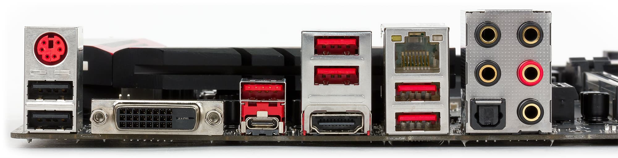| Разъемы на задней панели | 4 × USB 3.0 2 × USB 2.0 1 × USB 3.1 (Type A) 1 × USB 3.1 (Type C) 1 × HDMI 1 × DVI-D 1 × RJ-45 1 × S/PDIF (оптический, выход) 5 × аудиоразъемов типа миниджек 1 × PS/2 |