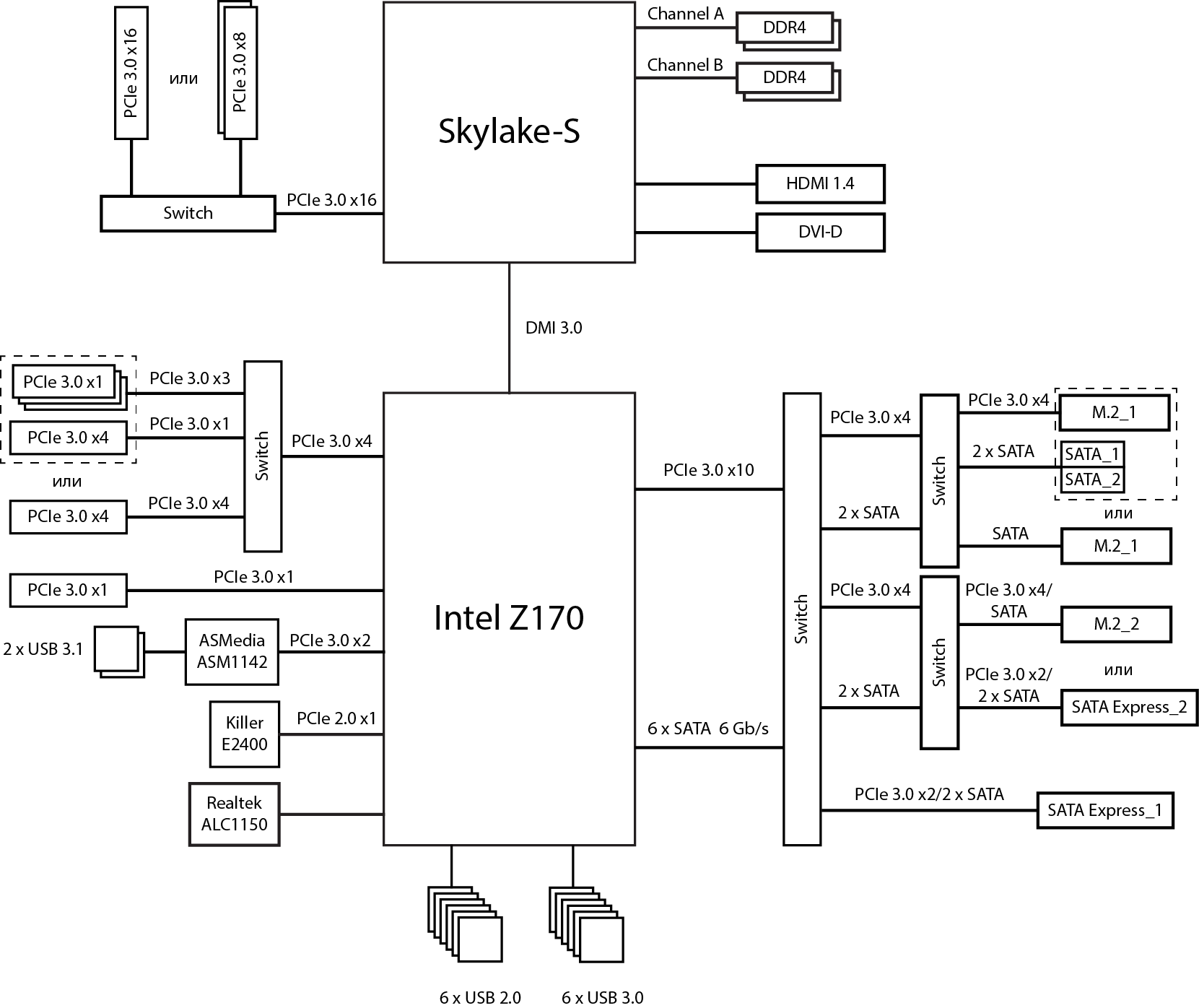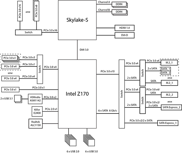 В руководстве пользователя приводится блок-схема платы MSI Z170A Gaming M5, однако, она довольно странная и ошибочная (там, к примеру, вообще забыт сетевой контроллер) и ответа на вопрос: как это работает, она не дает.
