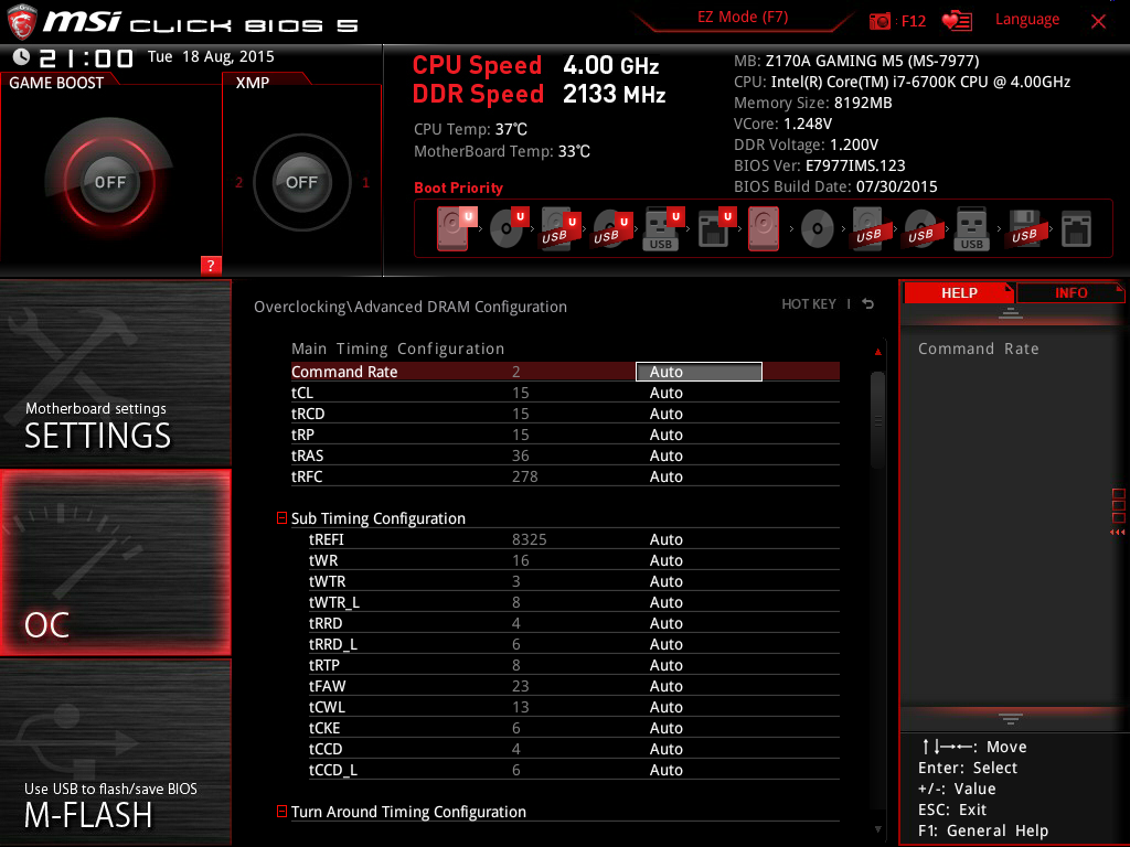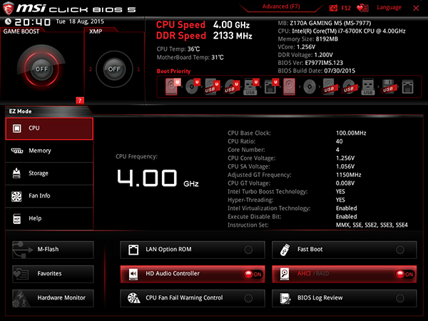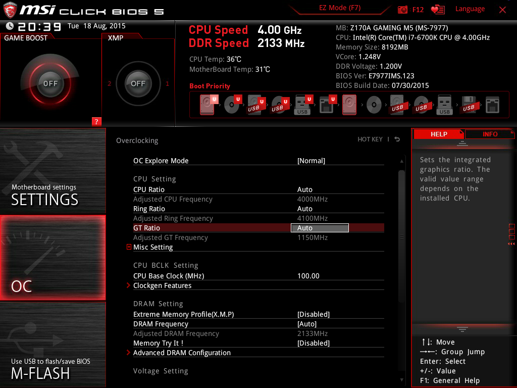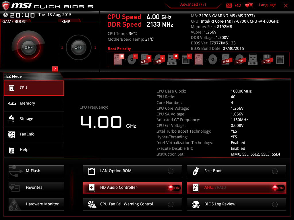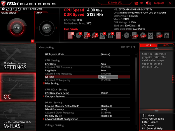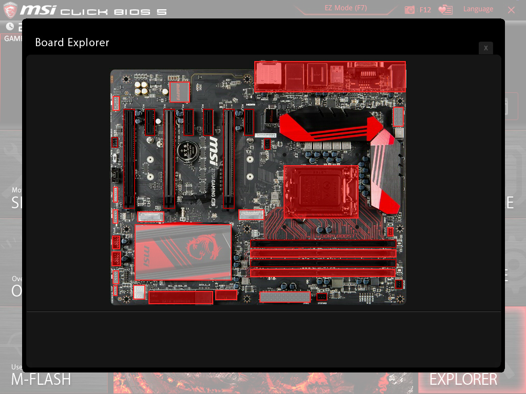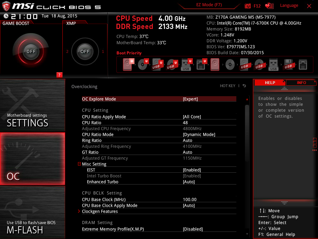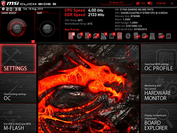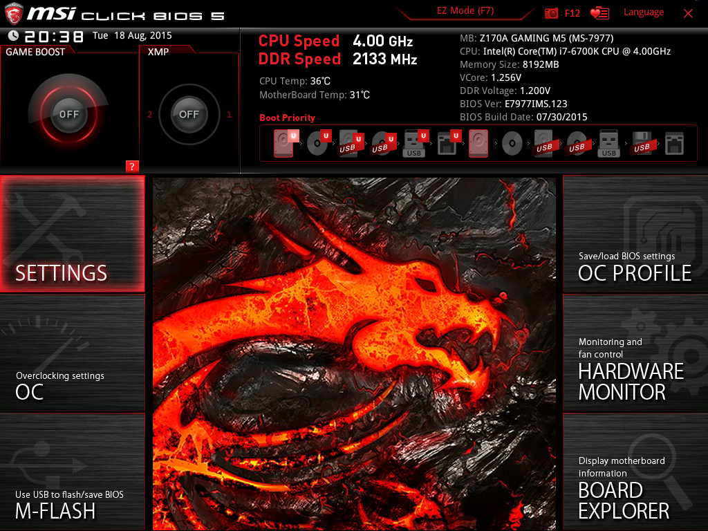 В режиме Advanced Mode на главном экране выводится основная информация о плате, процессоре и оперативной памяти, а также данные о температуре. Есть меню выбора загрузочного устройства и кнопки Game Boost и XMP для быстрого разгона процессорв и активации XMP профиля памяти. С главного экрана можно попасть в шесть подразделов: Settings, OC, M-Flash, OC-Profile, Hardware Monitor и Board Explorer.
