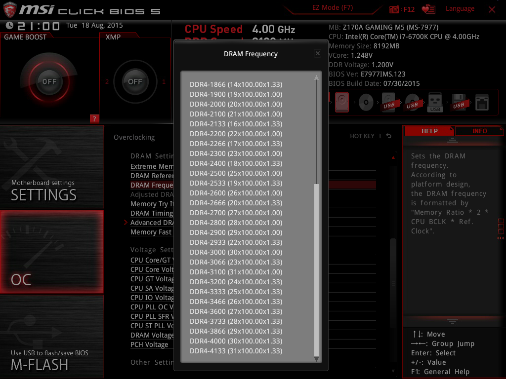 Для установки модулей памяти на плате MSI Z170A Gaming M5 предусмотрено четыре DIMM-слота. В руководстве пользователя отмечается, что плата поддерживает небуферизованную память DDR4 (non-EСС), а максимальный объем памяти составляет 64 ГБ (при использовании модулей емкостью по 16 ГБ). Естественно, поддерживается и память с XMP-профилями.